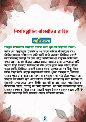 জি, অবশ্যই। এই বইতে এমন সব পরীক্ষিত কৌশল এবং নিয়মাবলী উল্লেখ করা হয়েছে, যা সঠিকভাবে প্রয়োগ করলে আপনার কিস্তি আদায়ের সমস্যা শতভাগ সমাধান হবে বলে আমরা আশাবাদী।